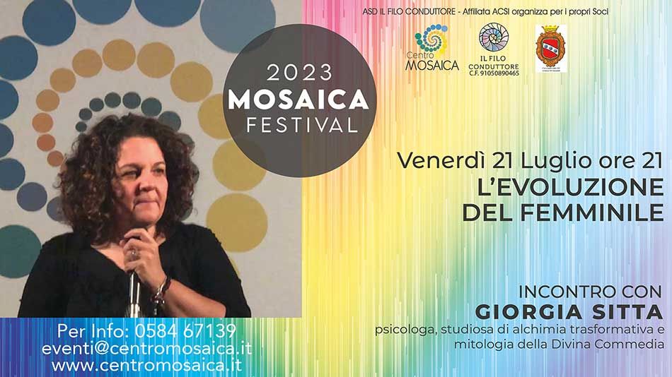 Mosaica Festival conferenza: “L’evoluzione del femminile” Mappa non disponibile Dettagli evento Data: 21/07/2023 Orario: 9:00 pm - 11:00 pm Mosaica Festival: 21 luglio ore 21.00 Conferenza di Giorgia Sitta dal titolo: “L’evoluzione del femminile” Per info e prenotazioni: 058467139 eventi@centromosaica.it
